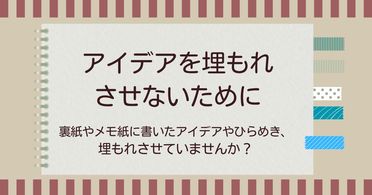 日常の中でふと思いついたアイデアや、ワークショップ・講座で得た学び。これらをメモ紙やプリントの裏に書き留めておくことはよくありますが、そうして書かれた紙は気づけば机の端に積まれたり、他の書類に挟まれて行方不明になったりしがちです。偶然見つけて「そういえばこんなことを書いてたけど、何のことだったか思い出せない…」という経験はありませんか?多くのアイデアは発見されることなく埋もれてしまっているのです。