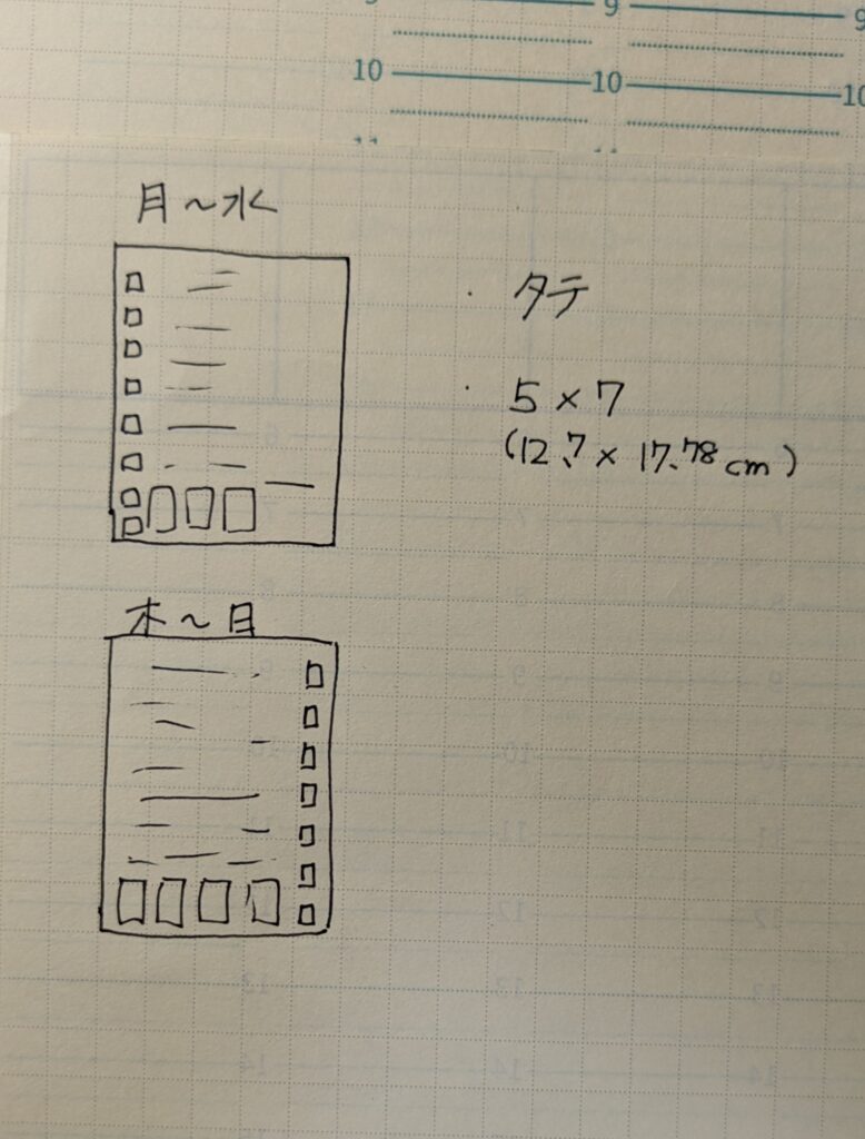 曜日ごとに月〜水用、木〜日の2種類のフォーマットを作成。日にちは手書き仕様にしたことで印刷フォーマットは2種類と少なくし作成のハードルを下げました。 使っている途中で改良したくなるかもしれないのでまず2か月分を印刷しました。
