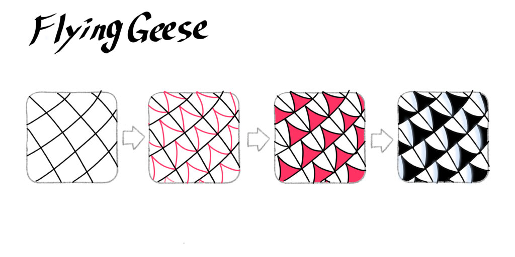 ①鉛筆で薄くストリングを描きます②星と三角の2辺を描きホリバーを描きます③ジェティズを描きます。ジェティズのまわりをオーラ(ひとまわり外側に線を描きます)④ホリバーで区切られたスペースに好きなタングルを描きます。 ⑤鉛筆で影を入れ擦筆(または綿棒)でぼかします ⑥ジェリロールペン(ゴールド)で好きなタングルなどを描きます