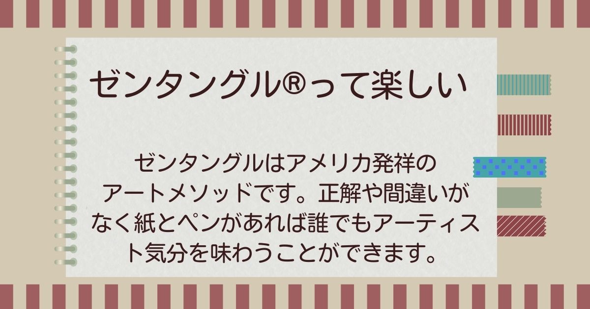ゼンタングル®はアメリカ発祥のアートメソッドです。絵を描くのが得意な人、そうでない人、誰でも、簡単にパターン化された模様を繰り返し描くことで素敵な作品を作ることが出来ます。