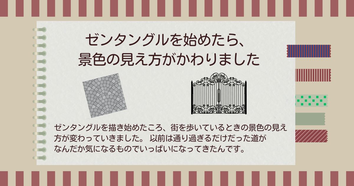 ゼンタングルを描き始めたころ、街を歩いているときの景色の見え方が変わっていきました。 以前は通り過ぎるだけだった道が、なんだか気になるものでいっぱいになってきたんです。